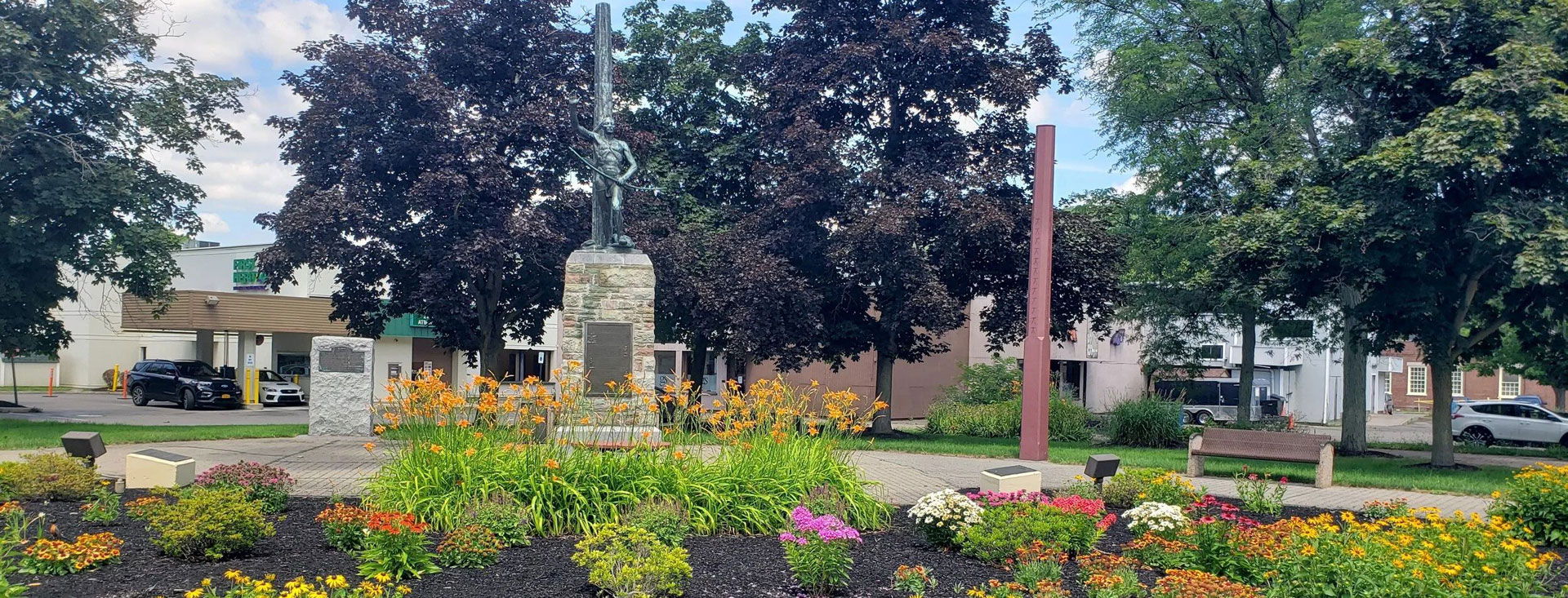 The Town of Painted Post was first organized on April 5, 1791, and comprised the territories of Hornby, Corning, Caton, Campbell, Erwin, Lindley, Tuscarora, Addison, and Thurston. When Steuben County was organized in March 1796, the Town of Painted Post was reduced to the first six towns and they were called ranges. Corning was the last township to bear the name of Painted Post and retained it until 1850. Now the name of Painted Post is applied only to the beautiful village which clusters around the site of the Indian replica of a painted post which once gave name to the whole area. The citizens of the Village of Painted Post take pride in the name, perpetuating the name with a replica of the post and a statue of Chief Montour adjacent. Norman Phelps designed the Indian monument which was erected in 1950. A citizens’ subscription drive headed by E.J. Smith financed that project. Today, a different Indian replica stands proudly in the Village Square. An earlier Indian replica has been restored and resides in the Village Hall.